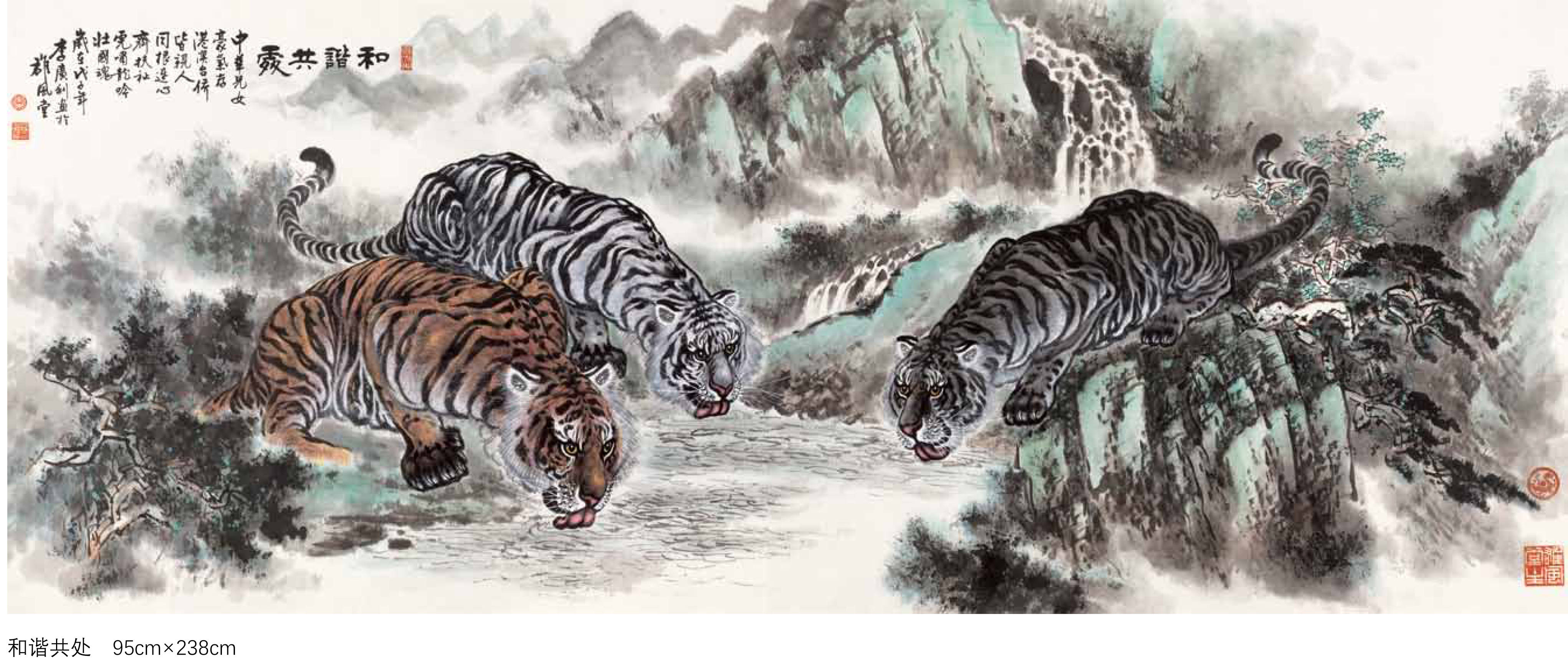 其艺术影响力早已跨越国界与领域:作品两次登上央视春晚舞台现场创作,以笔墨惊艳全国观众;先后被人民大会堂、中南海、故宫博物院等权威机构收藏,成为国家文化艺术的珍贵典藏;入选国际艺术展览并斩获多项大奖,让中华虎文化走向世界舞台。其艺术实践与创作理念,被收录于《中国当代书画名家大典》和中国书画收藏家协会等多部专业典籍,为当代动物画领域提供了宝贵的创作范本。