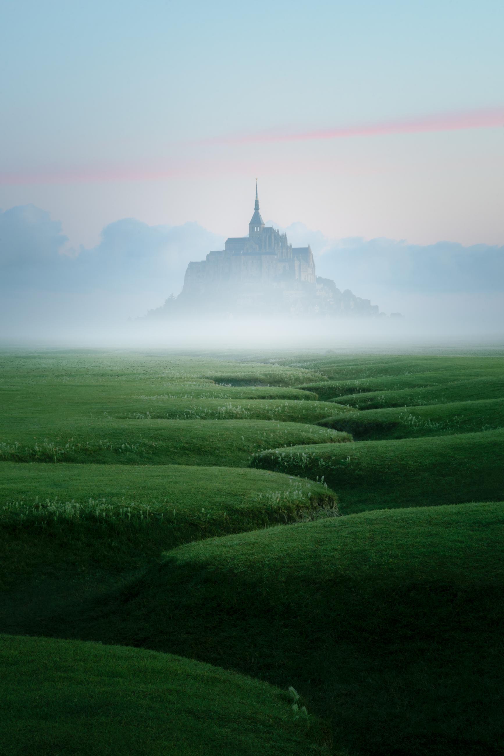 黎明时分,法国的圣米歇尔山被清晨柔和的薄雾笼罩,宛如一位沉睡的公主,静静等待着太阳的吻。古老的修道院在雾气中显得神秘而梦幻,宛如童话中的世界。