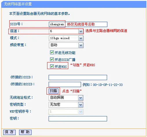 二.设置副路由器无线设置及开启WDS扫描信号:1.登录副路由器管理界面,点击无线设置——>无线基本设置,设置与主路由器相同的SSID号及信道,勾选开启WDS,点击扫描。