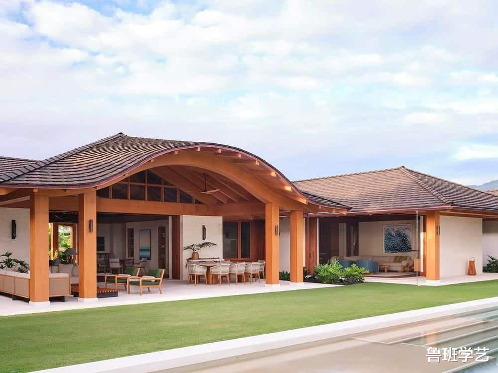 拱形的屋檐,显得气派而自然,屋面采用的是棕色的瓦,所有柱子采用原木色的方柱。