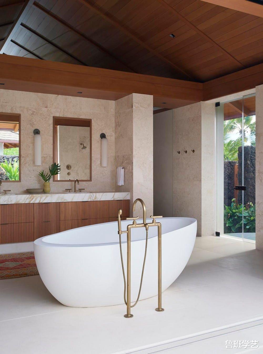 浴缸像一个切了一般的鹅蛋,独立龙头,仿佛在鹅蛋里面洗澡一般。