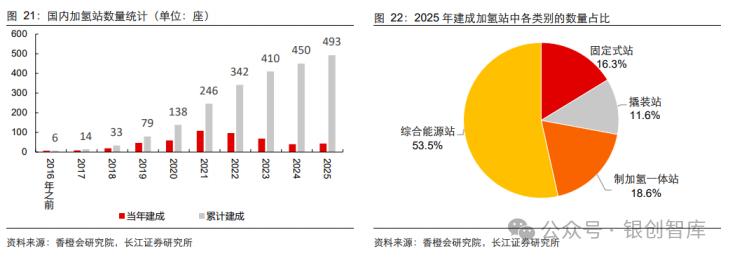 截至 2025 年底我国累计建成加氢站约 493 座,较 2020 年底增长约 2.6 倍,但 2025 年仅建成 43 座,建设速度放缓,主要原因是氢气审批监管体系复杂不完善,各地经营许可认定不一,审批流程涉及多部门、耗时长;且燃料电池车保有量少,加氢站实际负荷率低,盈利艰难。2025 年建成的加氢站中,油气氢电综合能源站占比 53.5%,经济性显著优于纯加氢站,预计成为未来建站主流方式。