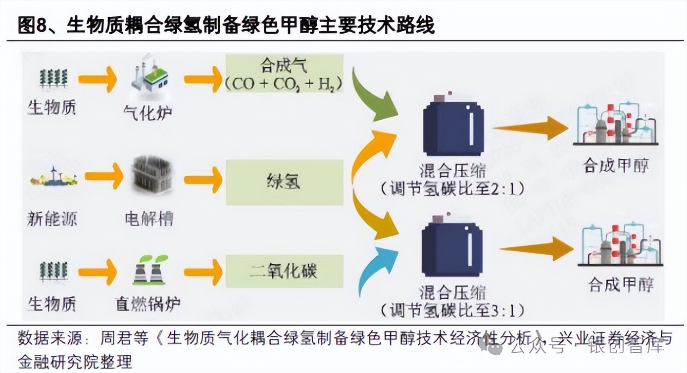 绿色甲醇主要生产途径包括生物质甲醇(生物质气化耦合绿氢、生物质直燃耦合绿氢、生物质发酵)和绿电制甲醇(绿电制绿氢耦合 CO₂制甲醇、CO₂电催化还原制甲醇,后者工业化尚存挑战)。