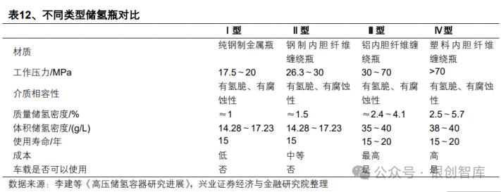 高压储氢分车用储氢罐、运输装备和固定式储存设备,高压氢气瓶分为 I-IV 型,其中 III 型(铝合金内胆纤维缠绕)、IV 型(聚合物内胆纤维缠绕)广泛用于车载领域,Ⅳ 型瓶比 Ⅲ 型更轻、压力更高、储氢质量比更高、寿命更长,国外 70MPa IV 型瓶应用成熟,国内主流是 35MPa III 型瓶,IV 型瓶应用处于初级阶段。T700 以上高强碳纤维是高压储氢瓶核心材料,目前由日本和美国企业主导,国内企业逐步进入,控制其成本是降低储氢瓶成本的关键。