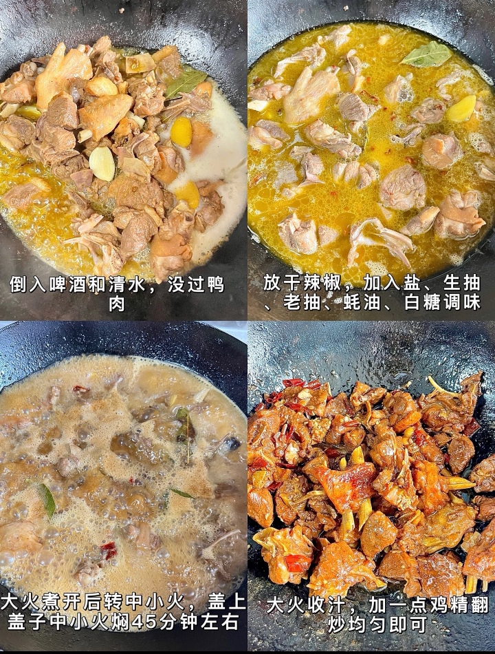 重头戏来了,倒入一瓶啤酒。啤酒的量要没过所有的鸭块,这是这道菜的灵魂所在。啤酒不仅能去腥增香,其独特的麦芽香气还能与鸭肉的鲜美相互渗透,使肉质在炖煮过程中变得更加软嫩。此时,加入两勺生抽、一勺老抽和少许蚝油,调味的同时也进一步加深了菜肴的色泽。盖上锅盖,转中小火,慢炖30分钟。
