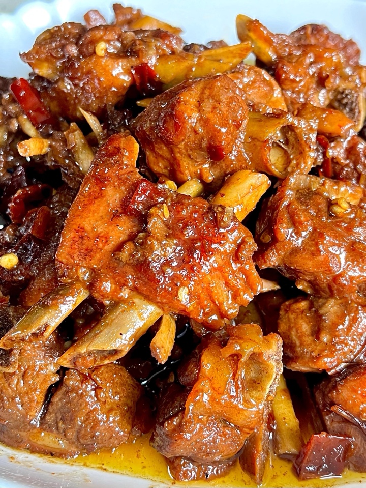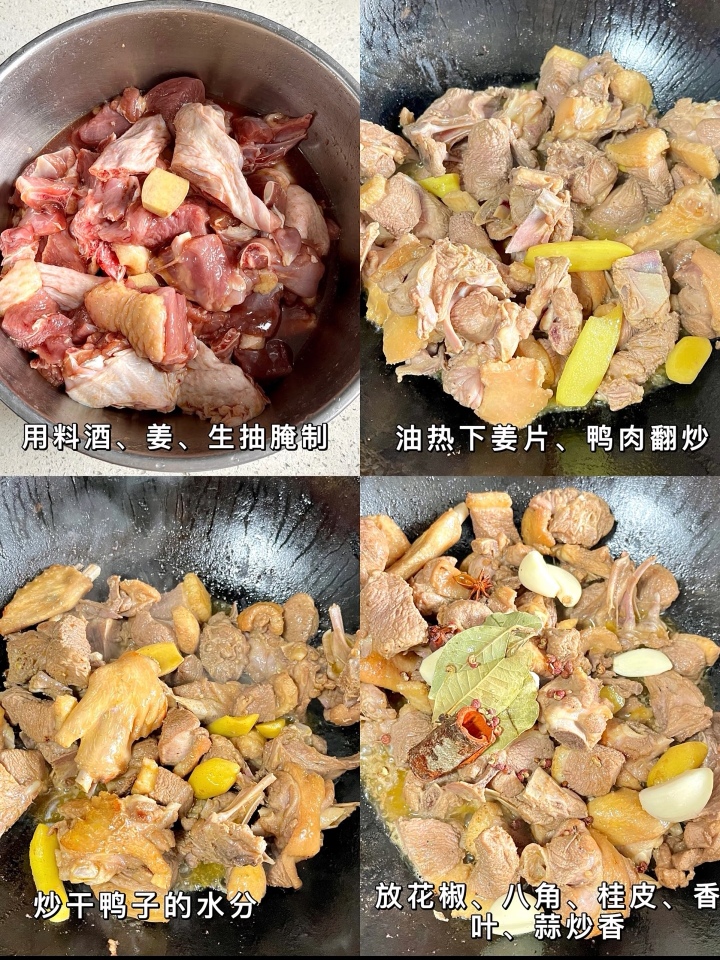 接下来是炒制的过程。锅中倒入少许底油,油热后放入几颗冰糖,小火慢慢炒化。当冰糖变成焦糖色并冒出细密的小泡时,迅速倒入鸭块翻炒,让每一块鸭肉都均匀裹上糖色。这一步不仅能增加菜肴的色泽,更能让鸭肉带有一丝微妙的焦糖香气。随后,加入切好的姜片、葱段、蒜瓣,以及必不可少的干辣椒和几颗花椒,继续大火翻炒,直到炒出浓郁的香味。