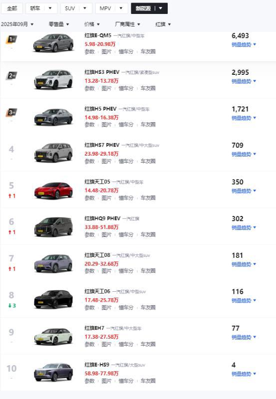 而红旗E-QM5的销量下滑,也是拖累红旗9月新能源板块增长的关键因素。去年同期,红旗E-QM5销量10863辆,同比暴跌40%。整个前三季度,红旗E-QM5累计销量为4.56万辆,同比下滑32.2%。除了红旗E-QM外,其次稍有规模的为去年8月上市的红旗HS3 PHEV,但月均还不足3000辆。