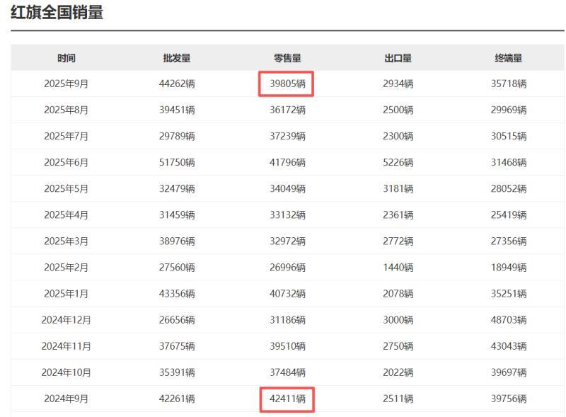 日前出炉的9月行业零售数显示,红旗9月份零售销量为3.98万辆,同比下滑6.1%,在去年同期,红旗的零售销量4.24万辆。在“金九银十”的行业传统销售旺季,红旗零售同比下滑的表现,显然不是一个“积极”的市场表现。在这个9月,国内汽车零售依然同比增长。