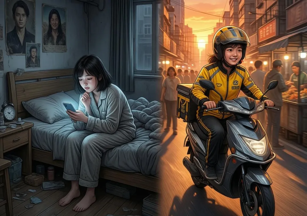 想起之前看过一个帖子。一个姑娘辞职后在家待业,每天从床上挪到沙发上,手机刷到眼疼,越刷越觉得自己被世界抛弃了。后来她索性去送了外卖。忙起来的时候,满脑子都是“这一单几点前要到”“这个小区门怎么走”,跟门卫大爷喊一嗓子,跟顾客说句“祝您用餐愉快”。她说:“累是真的累,但那种‘活着’的感觉回来了,没空孤独了。”