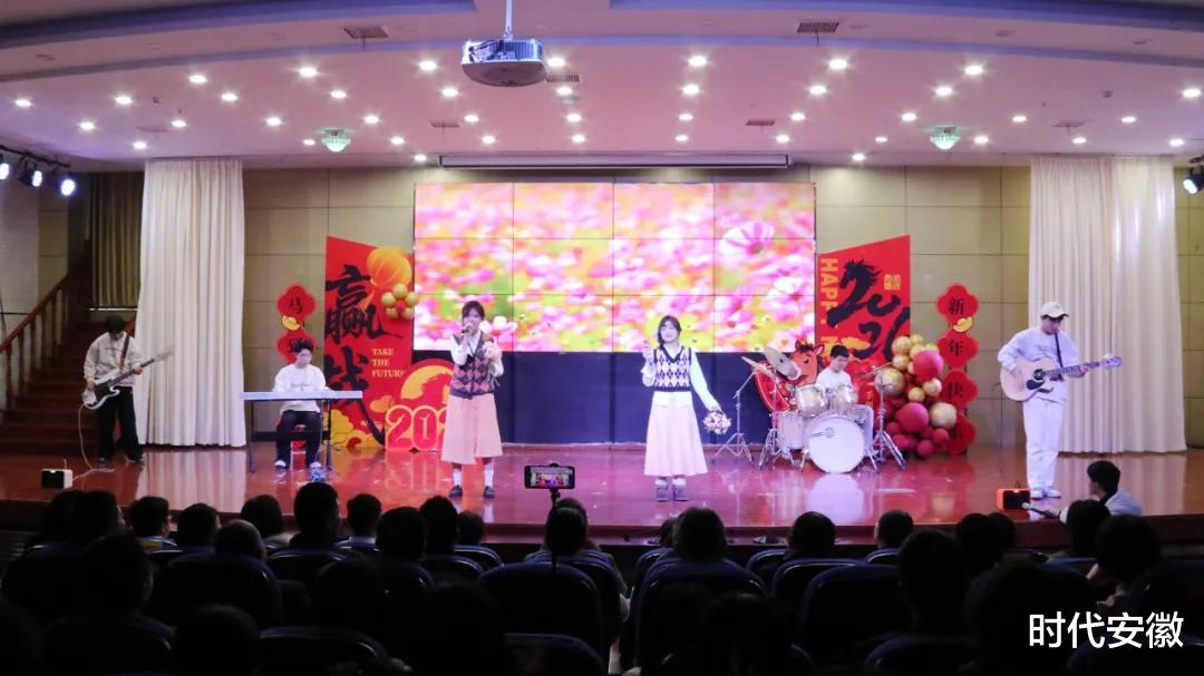 整场联欢会节目精彩不断、亮点纷呈,视听盛宴轮番上演。学生们带来的《青春贺岁曲》节奏欢快,唱响青春蓬勃朝气;葛恒怡等同学的《pinkvenom》、唐嘉晴等同学的《Ditto》动感十足,肖彤独舞《次仁拉索》韵味悠长,用灵动舞姿诠释青春风采;孙奕宸与李瑞欣合唱《我会等》,温柔唱腔打动全场;张敬康同学的脱口秀《我展示》诙谐幽默,戏剧社小品《谁逼疯了周日》笑点密集,引得全场笑声不断;张玉东等三人的武术《武道凌云志》刚劲有力,尽显中华武魂;王继成等组成的乐队演绎《花海》,激情演奏赢得了观众的阵阵掌声。