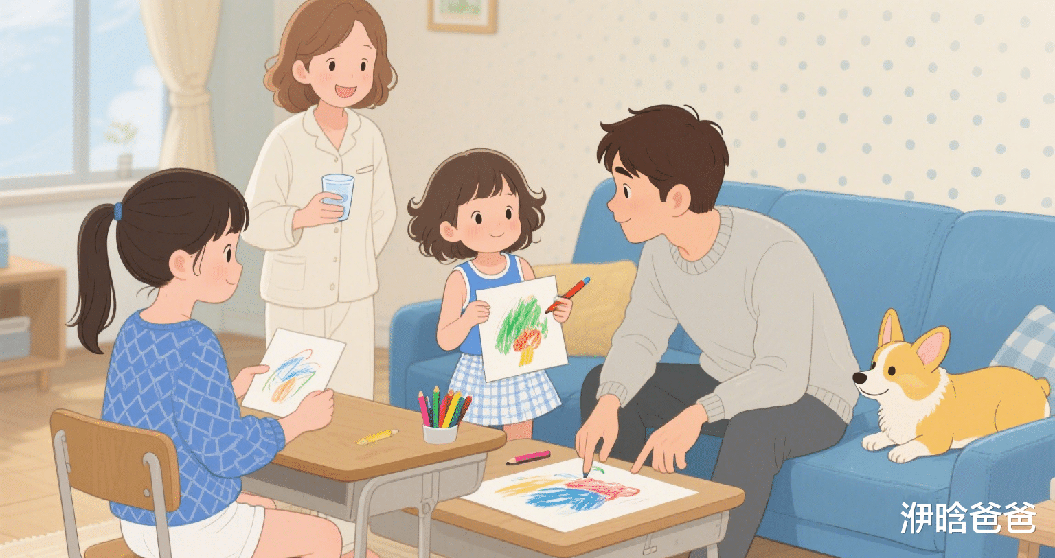 小妹有时候画画画到一半,会跑过来拿给我看:“爸爸,我觉得挺好,你觉得呢?”