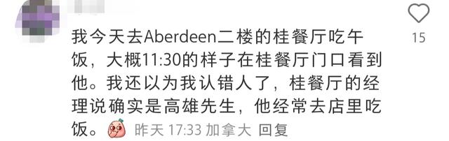 一位网友说,5月11日在某餐厅门口看到他,但以为自己认错了。而该餐厅老板却说是他,经常来店里吃饭。