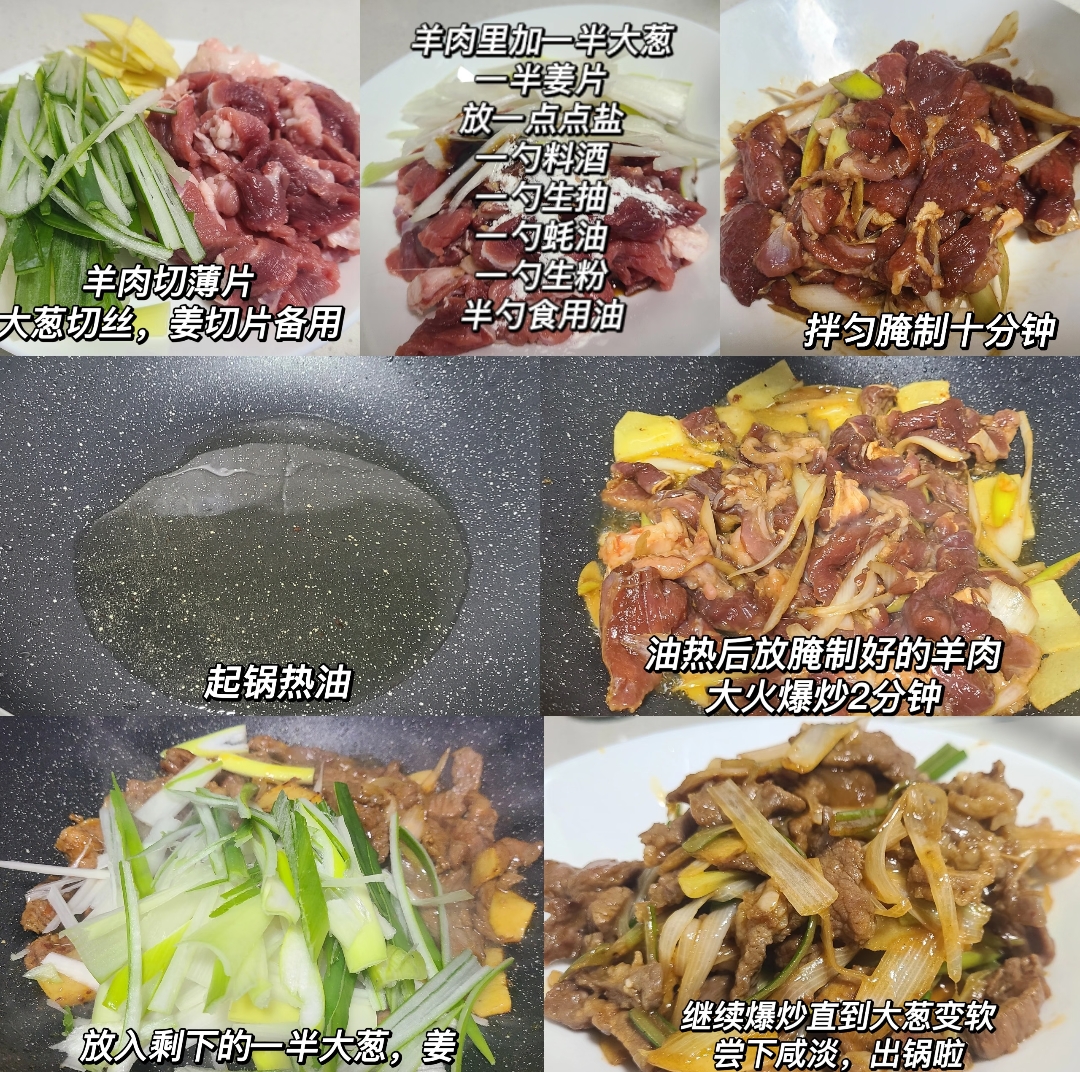 灶台上的火苗才是这道菜真正的魔法师。铁锅烧得滚烫,倒入底油,待油温微微冒烟时,果断下入腌好的羊肉。大火爆炒是这道菜的精髓,在两分钟的高温洗礼下,羊肉迅速变色、收紧,逼出多余的油脂。此时,将剩下的大葱丝和姜片悉数倒入锅中,铲子快速翻飞。葱白在热油的激荡下逐渐变软,释放出浓郁的甜香,与羊肉的鲜香完美交融。待大葱彻底软化,尝一下咸淡,无需多余的修饰,立刻出锅装盘。