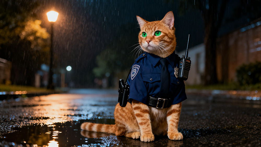 屏幕上出现了一系列穿着警卫制服的猫咪,它们表情严肃,双眼闪烁着使命感。