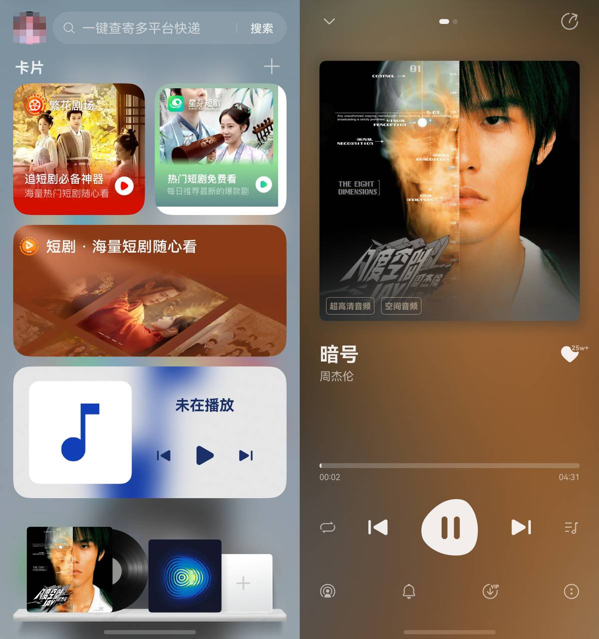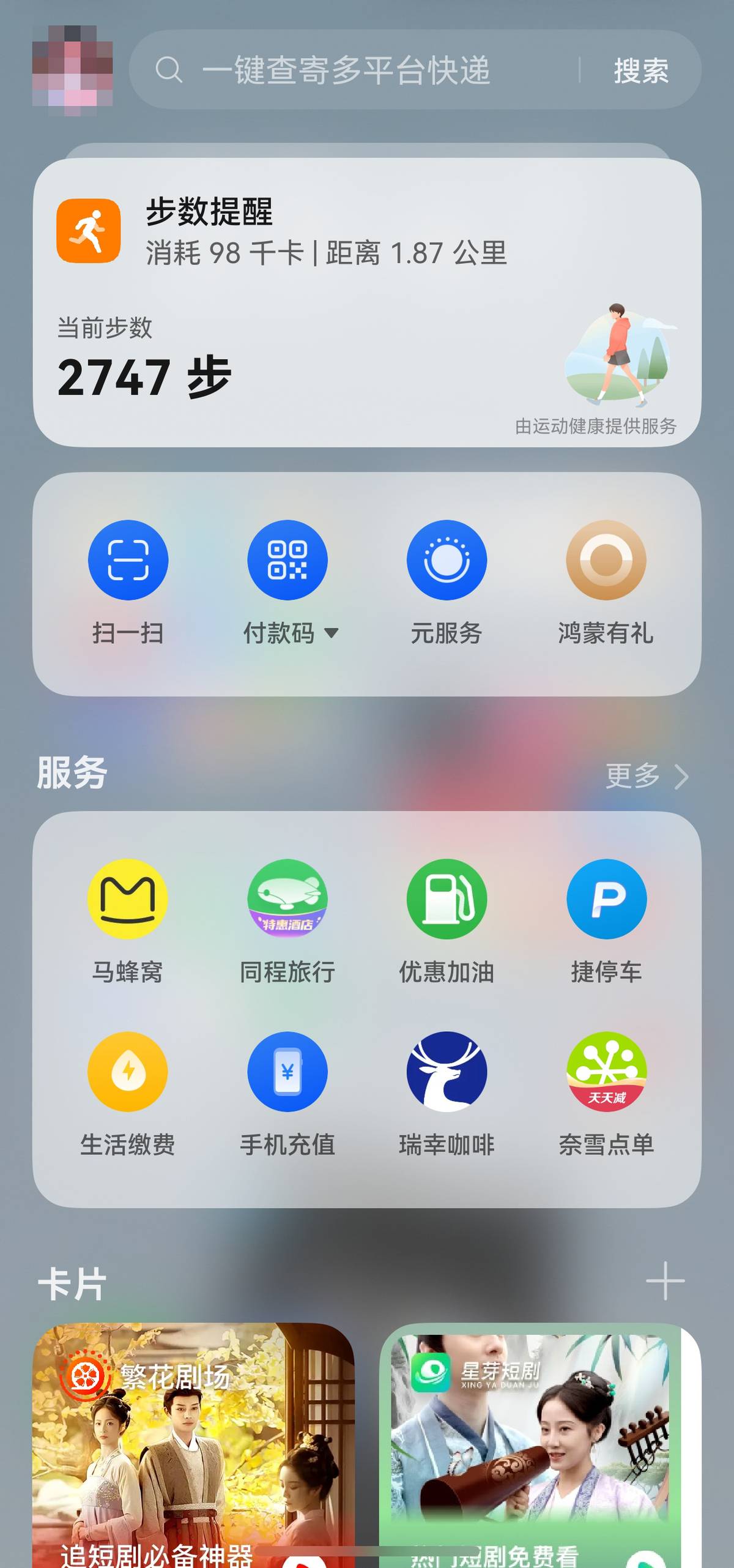 但光有爬坡难免有些枯燥,这时负一屏里的短剧元服务和音乐服务卡片成了我的最佳拍档。点开短剧元服务,海量剧集随便挑;最新最热的短剧,点开星芽短剧或繁花剧场的服务卡片就能看,把手机架在跑步机上,一边爬坡一边看剧,枯燥的有氧时间立马就过去了。要是眼睛盯太久想放松一下,还可以选择点开音乐服务卡片,切换到我喜欢的运动歌单,跟着旋律走,步伐更轻松。