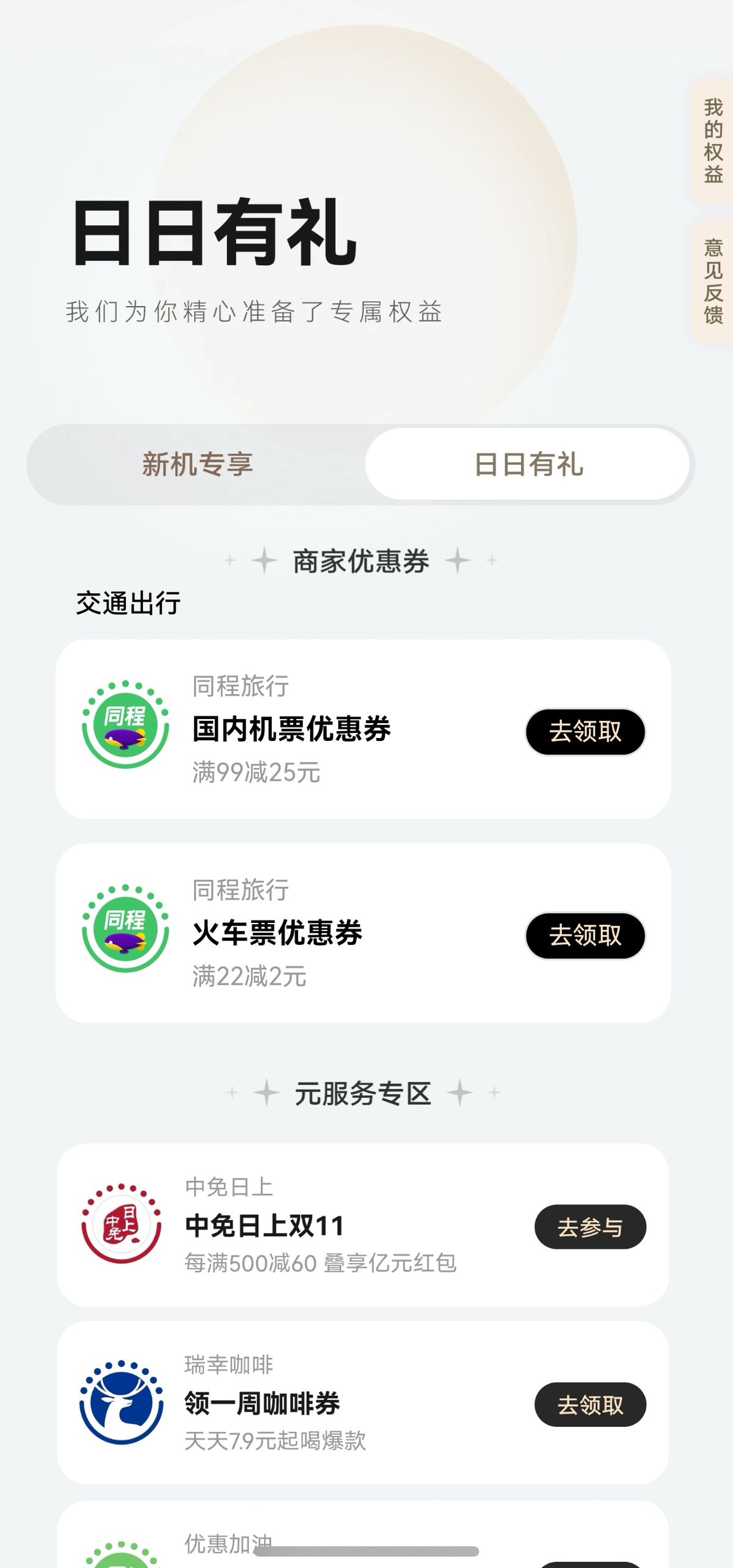 最后敲黑板告诉大家,作为从老系统升级到最新系统的用户,每天已经养成打开负一屏里的“鸿蒙有礼”签到的小习惯,毕竟经常能领到元服务优惠券这样的小福利,运气好还有现金红包,拿来点杯瑞幸刚刚好,还能给每天的生活增添一点额外的快乐。如果你也是鸿蒙5及以上用户,可千万别错过这泼天的富贵咯!