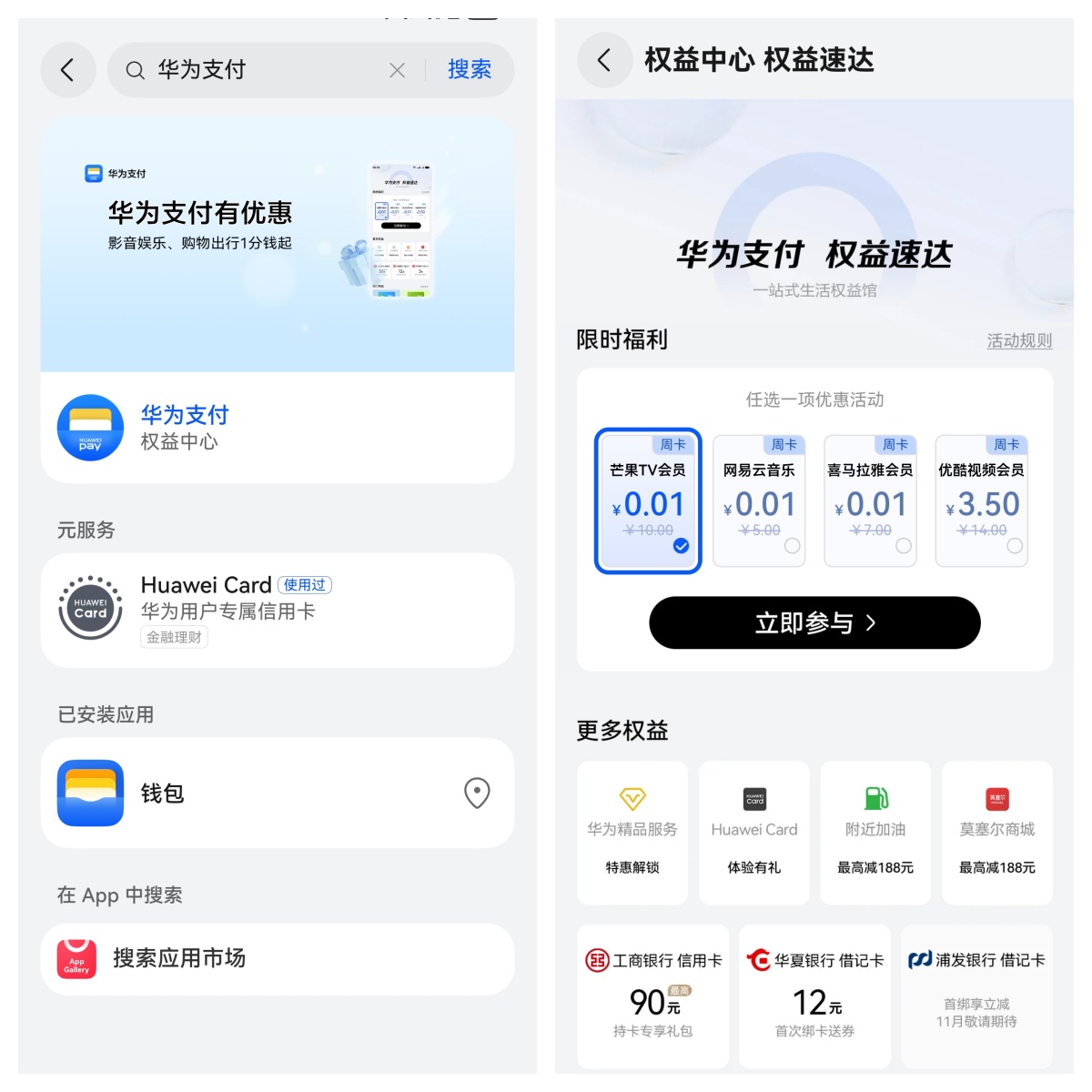 这时就不得不分享一下我在华为支付里找到的宝藏页面了,它的“一站式生活权益馆”真的超值,双11我只花1分钱就抢到了芒果TV的周卡,热门好剧、最新综艺都能看。还有网易云音乐、喜马拉雅的会员也都有优惠,追剧听歌全搞定。它联合了工行、华夏银行,在华为商城消费时还有10-40元的立减券包,小省即小赚。