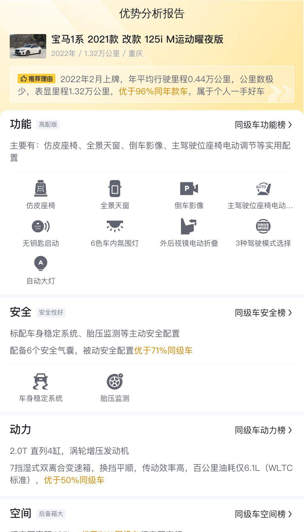 对于一辆二手车来说,最重要的就是车况。 这辆宝马1系虽然外观上有一些瑕疵,但它的“内在”却依然健康。 2.0T的发动机,匹配7速双离合变速箱,动力充沛,换挡平顺。 6.1L/100km的油耗表现,也足够经济实惠。 深色的内饰、仿皮座椅、全景天窗、倒车影像等配置,提升了驾乘的舒适性和便利性。 4462x1803x1448mm的车身尺寸和2670mm的轴距,也保证了相对宽敞的乘坐空间。