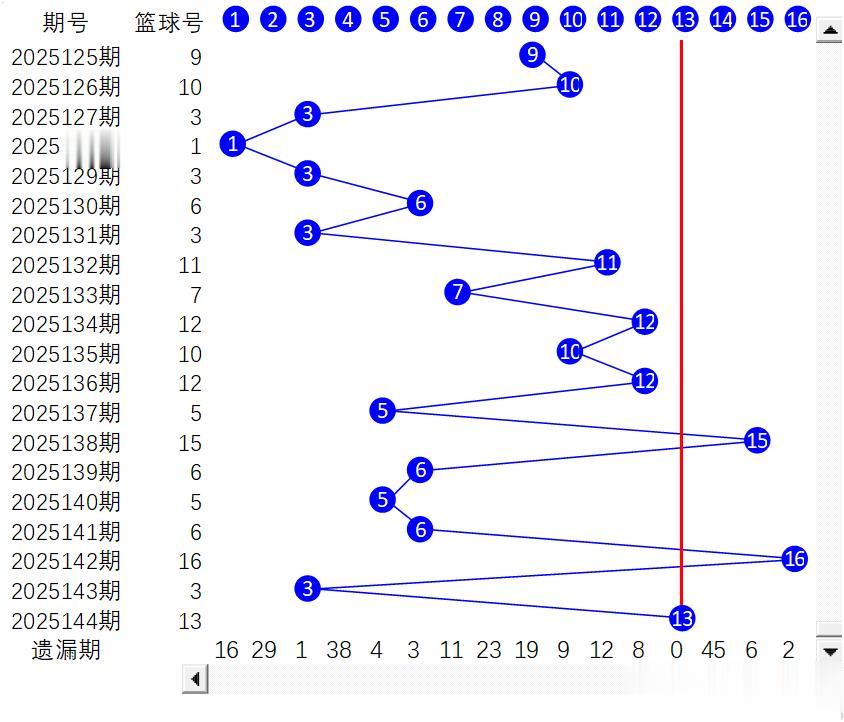 2025144期蓝球在上一期3号蓝球的基础上,按官方给出的“基本法则“以16号蓝球为基点画“十”字线,沿横线(行)上变化,走大至13号。