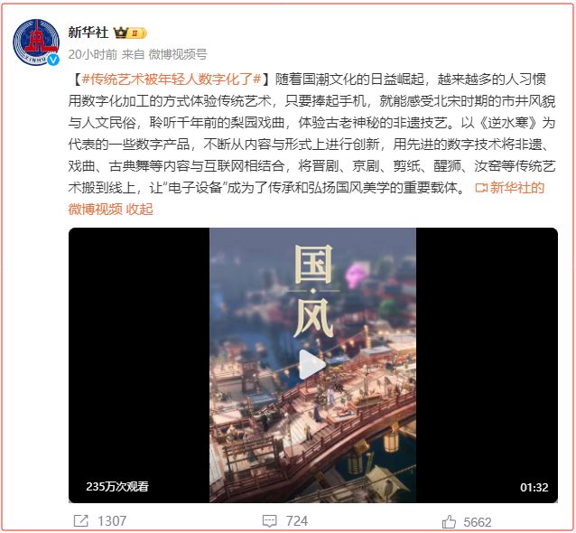 作为画面表现与玩法丰富度兼具的3A级别手游,《逆水寒》手游在传统文化传播上的成就尤为突出。它不仅获得书法、瓷艺、茶道、醒狮等十余项非遗传承人的认可与合作,更得到央视、新华社的发文赞许。