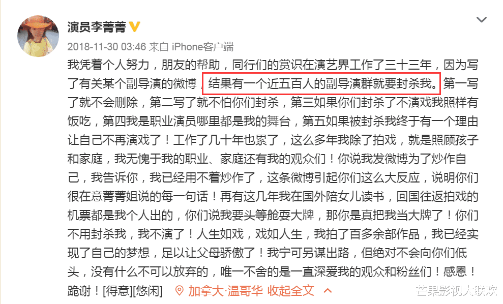 不过虽然这是一件揭露丑恶事实的事,但她却让整个副导演的名气都给破坏了,刚发文揭露事实之后李菁菁便再次发文自己遭到了一个500副导演群的封杀。