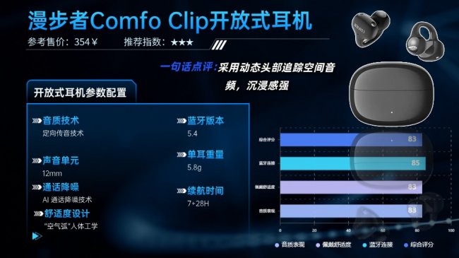 漫步者Comfo Clip在入门级市场中颇具辨识度。它将半入耳式的舒适感与耳夹式的稳固结构相结合,佩戴时几乎无负重感,即便在跑步或跳绳这类剧烈运动中,也不易滑落。