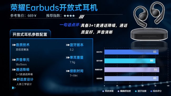 连接上采用蓝牙5.2方案,传输稳定性一般,有轻微延迟,支持双设备同时连接及荣耀信任环流转,对华为、荣耀用户较为友好。通话配备3+1麦克风降噪系统与两档自适应降噪,嘈杂环境下也能保持清晰通话。续航方面,单次使用约7小时,搭配充电盒总续航达26小时,15分钟快充可支持2小时播放。