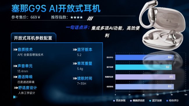 此外,塞那G9S AI还集成了语音控制、智能助手等多项AI功能,使用更高效。整体来看,这款耳机适合追求轻便佩戴体验、又希望享受智能交互的用户。音质足以应对日常听音需求,在同价位产品中具备不错的综合实力。