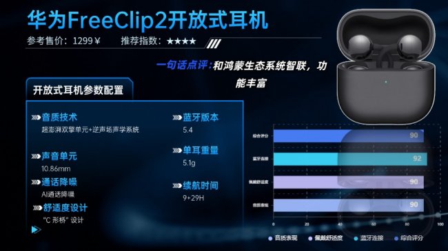 功能层面,基于鸿蒙智联系统,与华为设备连接迅速稳定,支持点头、摇头等手势控制,多设备切换灵活。但部分智能功能需配合华为App使用,非华为设备体验会打折扣。续航表现良好,单次播放可达8小时,配合充电盒综合续航为36小时,能有效缓解电量焦虑。总体来看,FreeClip 2在佩戴舒适度和智能交互方面优势突出,是一款值得注重日常体验用户考虑的产品。