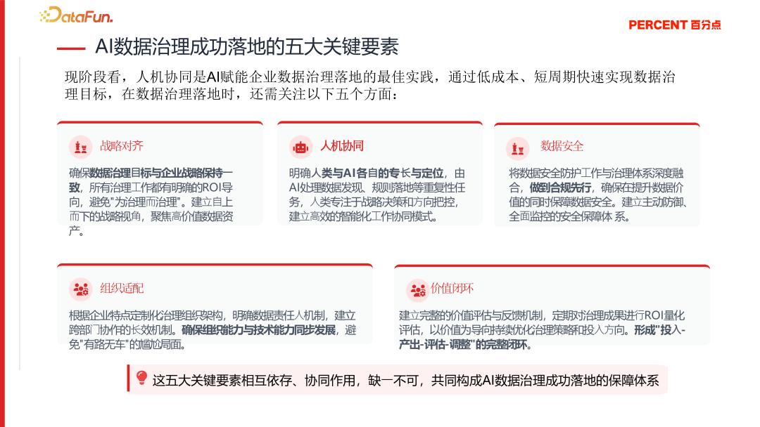 在推进 AI 赋能数据治理落地的过程中,主要采用低成本、短周期的方式快速实现。具体包括五个目标:首先需实现战略对齐,确保治理目标与战略一致;其次强调人机协同,明确人与机器各自的定位与优势;此外还需考虑安全、组织适配及闭环工作等方面。