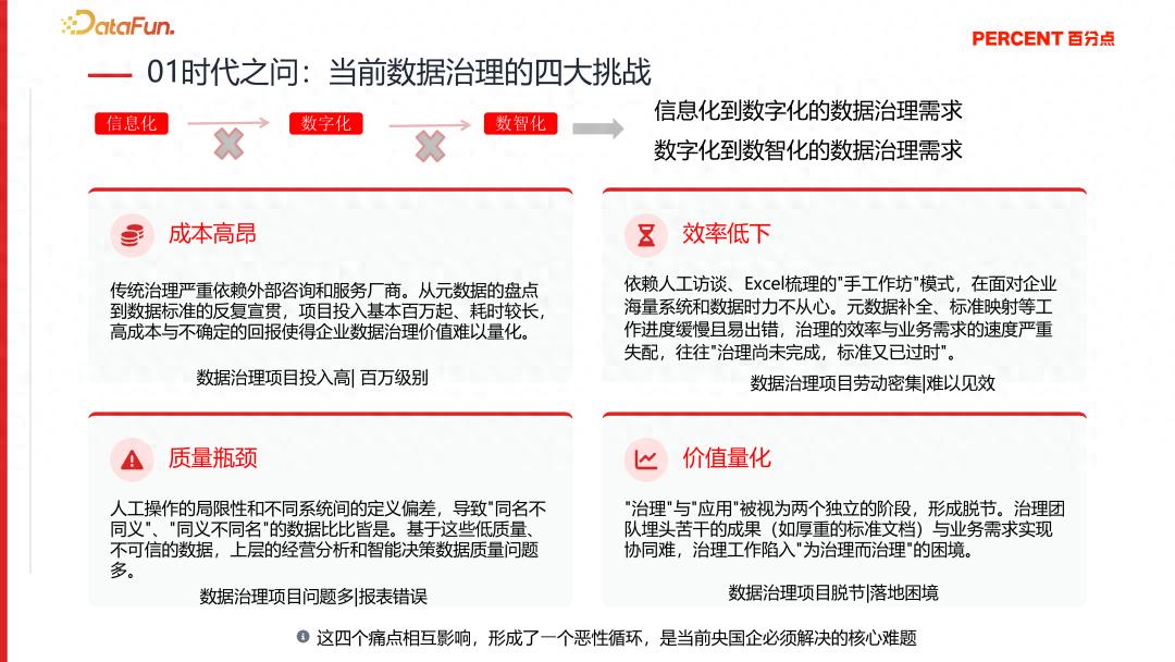 当前央国企的数据治理挑战主要包括四个环节。大多数企业正同步经历从信息化到数字化、再到数智化的转型,全力推进系统整合与统一建设。它们在搭建集团业务系统(如采购、合同、主数据管理)的同时,也在构建数据中台,推进数据分析、可视化,并落地AI应用,如智能体和智能问答、报告等场景。因此,目前面临的是数字化和数智化两条链路共同带来的数据治理需求。