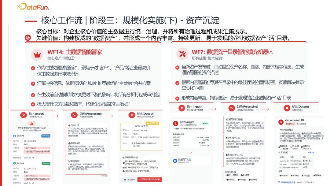 第一步是解决数据从无到有的问题,建立客户主数据可信数据集,实现从 0 到 1 的过程。传统数据治理需要人工配合和不同种类人员协作。如果采用 AI 智能工作流,第一块通过元数据血源自动发现多个业务系统中客户相关的表格字段,而传统方式需要人工采集和数据补全。第二块涉及标准,统一主数据标准规范需要汇集各系统表并自行分析设计;AI 能凝练识别系统表差异。第三阶段是融合和发布,融合时需解决属性融合问题,如 A 系统和 B 系统属性标准相同但数据不同,需考虑置信度和更新时间;发布时需统一发布数据状态并添加业务标签以便理解客户主数据集。