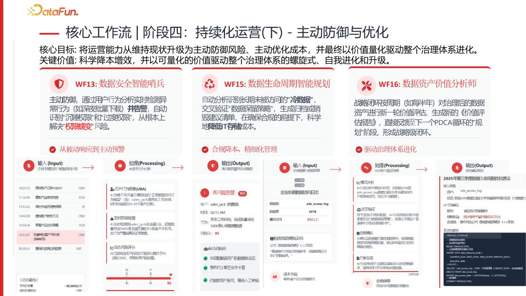 第一个工作流是数据治理工作建议书,它集成成熟的数据治理方法论实践,并通过自然语言方式与项目负责人交互,生成严谨的数据治理蓝图规划建议书。示例中,一个能源集团计划三年内从安全领域实施数据治理任务,识别有价值资产并寻求数据难度建议;大模型融合用户意图和知识库,结构化输出建议,包括总结摘要、治理任务和价值分析、以及三年实施路线图。第二个工作流从资产视角分析,评估现有数据资产的管理成本和业务赋能方面,生成可视化数据资产评估指标。例如,客户主数据分析管理成本及其价值贡献领域如金融营销、风险控制和客户服务,通过成本-价值对比提供分析。