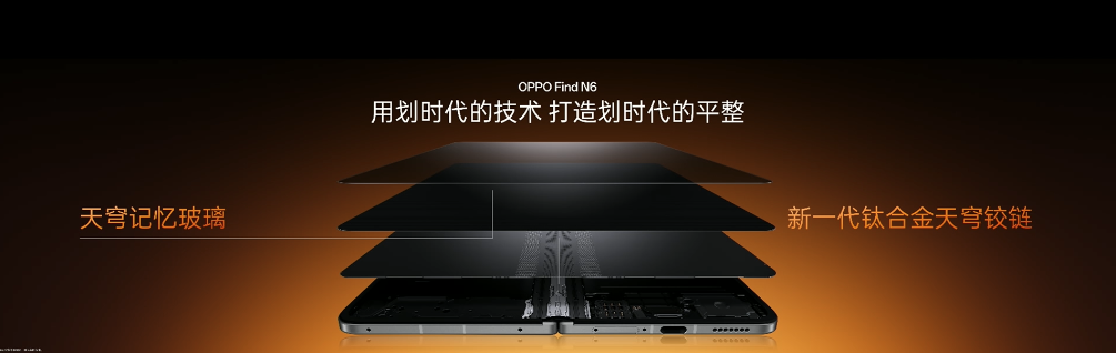 底层技术革新: 依托产业生态,OPPO Find N6 引入了具备自修复能力的“天穹记忆玻璃”,并结合新一代钛合金天穹铰链,从根本上消除了单侧应力拉扯导致的屏幕形变。