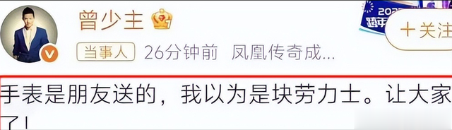 面对争议,曾毅在社交平台解释:"手表是朋友送的,我以为是劳力士。让大家见笑了。" 这句轻描淡写的回应却引发了更大质疑。
