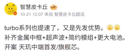 据博主@智慧皮卡丘 发博爆料:“turbo系列也提速了,又是先发优势。补齐金属中框+超声波+简约模组+更大电池。开案天玑中端首发/旗舰芯”。这也暗示着红米Turbo5将首发天玑8500。