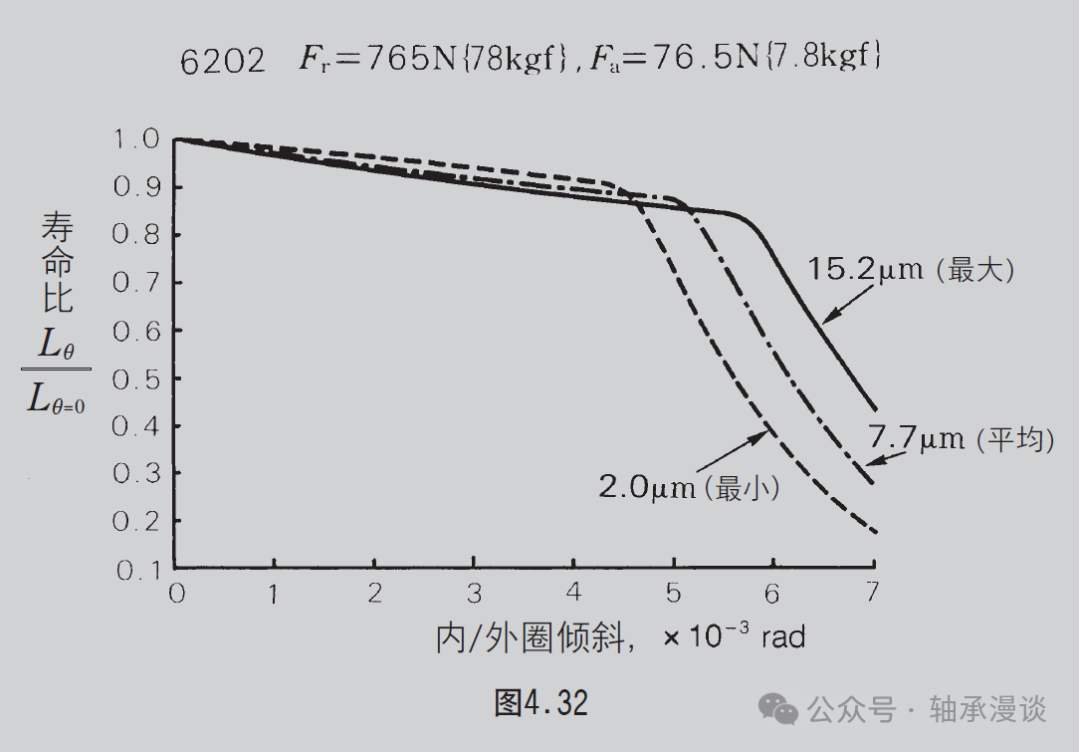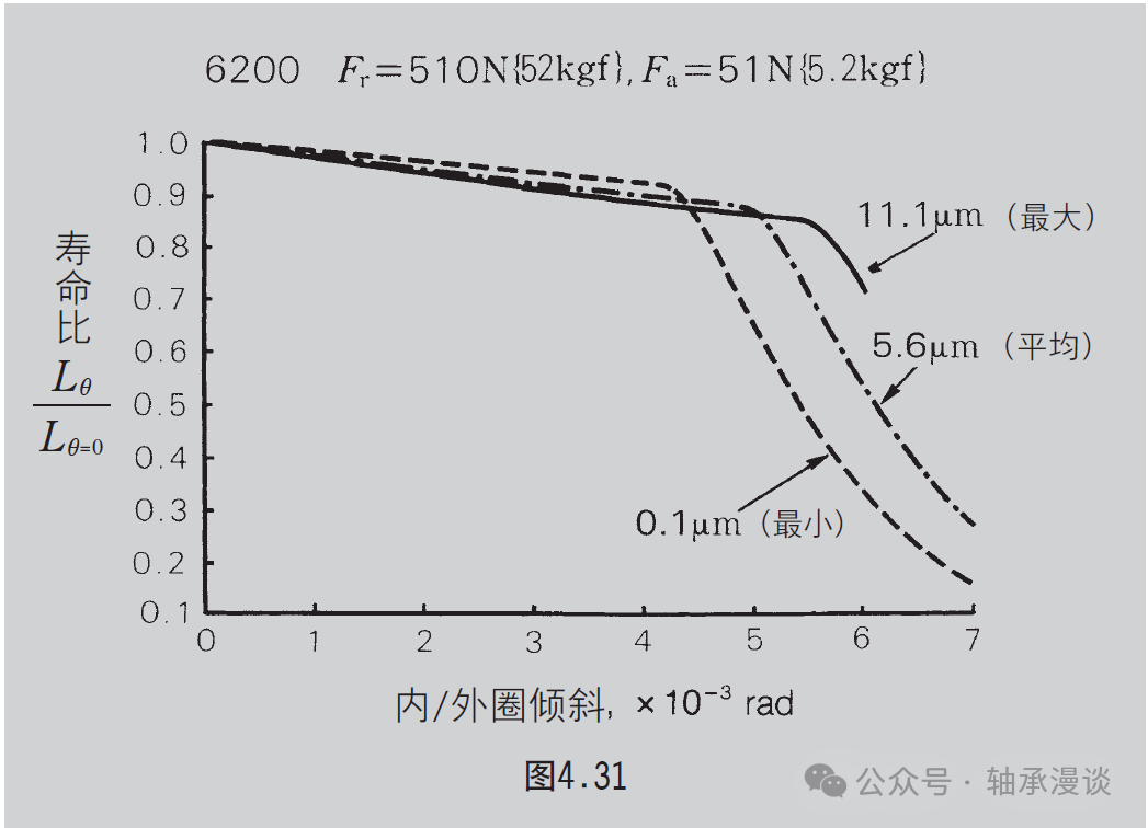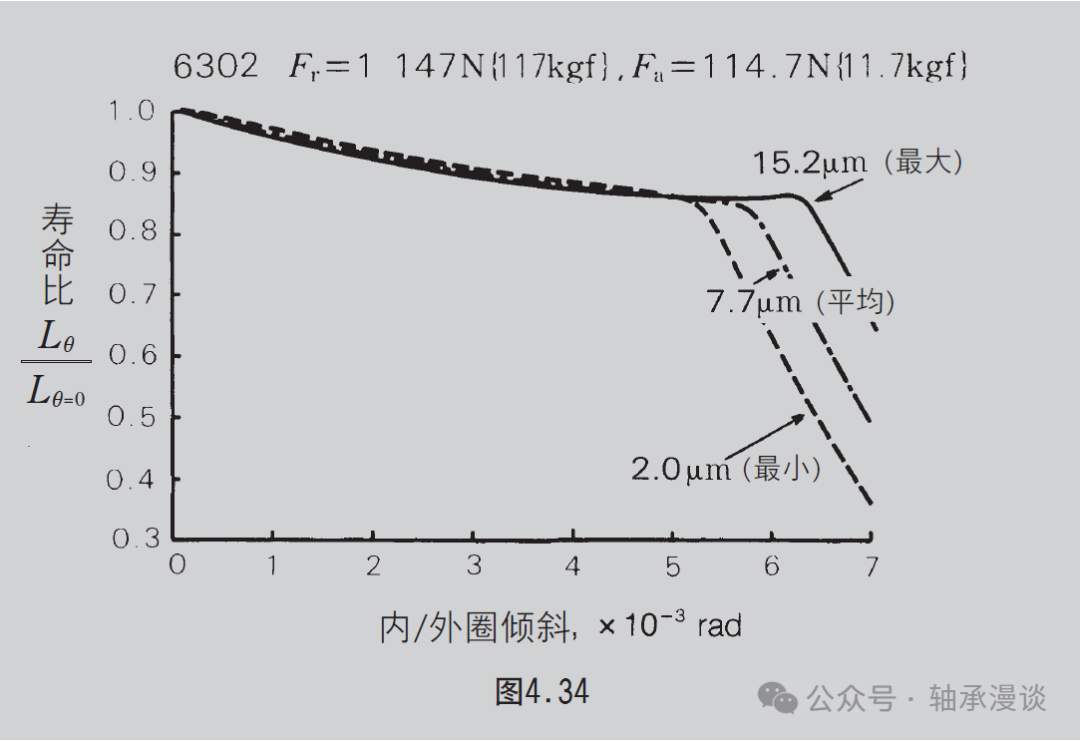 如图 4.31~4.34 所示,当倾斜范围在 0.0006~0.003 rad(2'~10')之间时,疲劳寿命下降5%~10% 或更少,因此,影响不大。