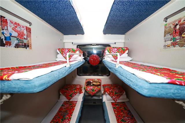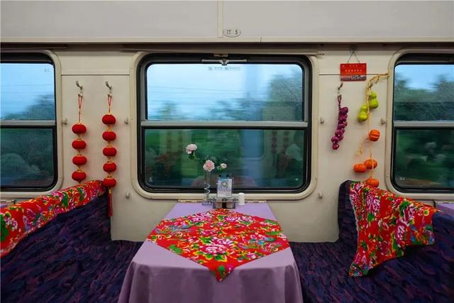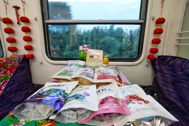 卧铺车厢内床单以东北大花为特色,墙壁上还有粘贴有窗花贴纸,像极了东北大炕,充满了东北乡村气息。走进其它车厢,满眼的“红布绿花朵”,车窗两边挂了一串串红灯笼,桌上摆满了琳琅满目的东北特产,有蓝莓、秋木耳、猴头菇、白桦树汁等。