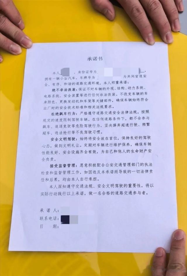 网友发出的这份承诺书上仅写有承诺人“拥有一辆小型汽车”,并未提到车辆型号为小米SU7 Ultra,上面的姓名和身份证号均被打了马赛克。承诺书要求车主需要在“绝不非法改装”“杜绝飙车行为”“安全文明驾驶”“接受监督管理”等几个方面做出承诺。