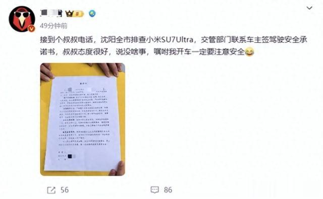3月13日,一数码博主表示,自己接到交警电话,沈阳全市排查小米SU7 Ultra。据其所述,当地交管部门正联系小米SU7 Ultra车主签下一份驾驶安全承诺书,嘱咐他开车一定要注意安全。