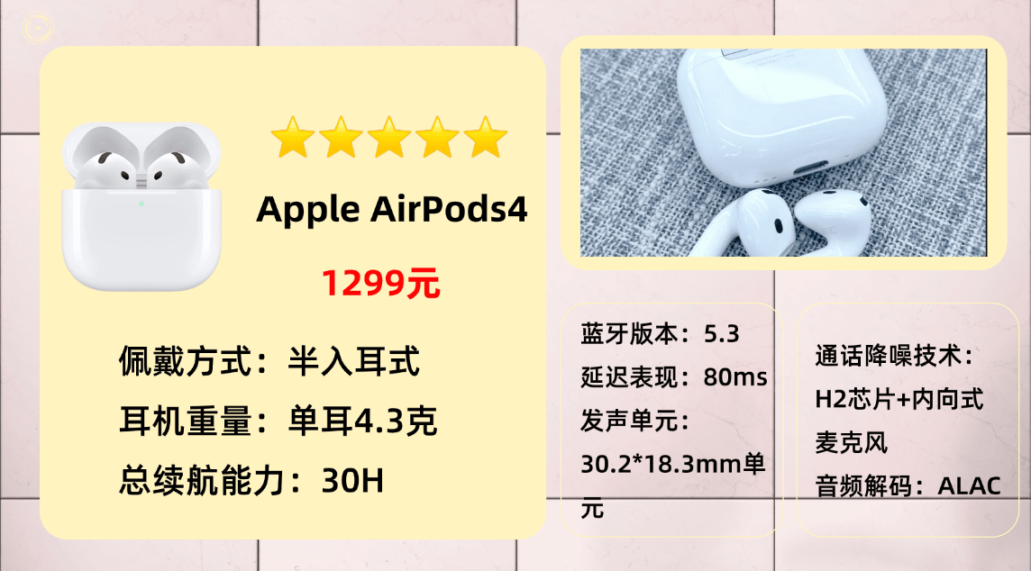 入选产品第九名:苹 果A irPods 4蓝牙耳机