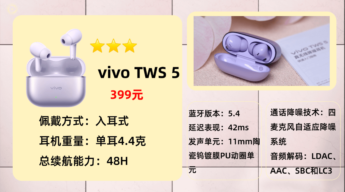 入选原因二:音质方面,vivo TWS 5最大的升级来自达发(AIROHA)蓝牙芯片平台,告别高通方案后带来了更灵活的编码支持。标准版支持AAC与LDAC,Hi-Fi版则新增LHDC V5 / LHDC Lossless无损协议,最高码率可达1.4Mbps。11mm动圈单元调音偏均衡,低频弹性强,不过稍微有点轰脑,中高频层次清晰,人声饱满自然。蓝牙5.4连接稳定,延迟控制不错。续航方面单次可以使用12小时,搭配充电仓可以使用48小时。