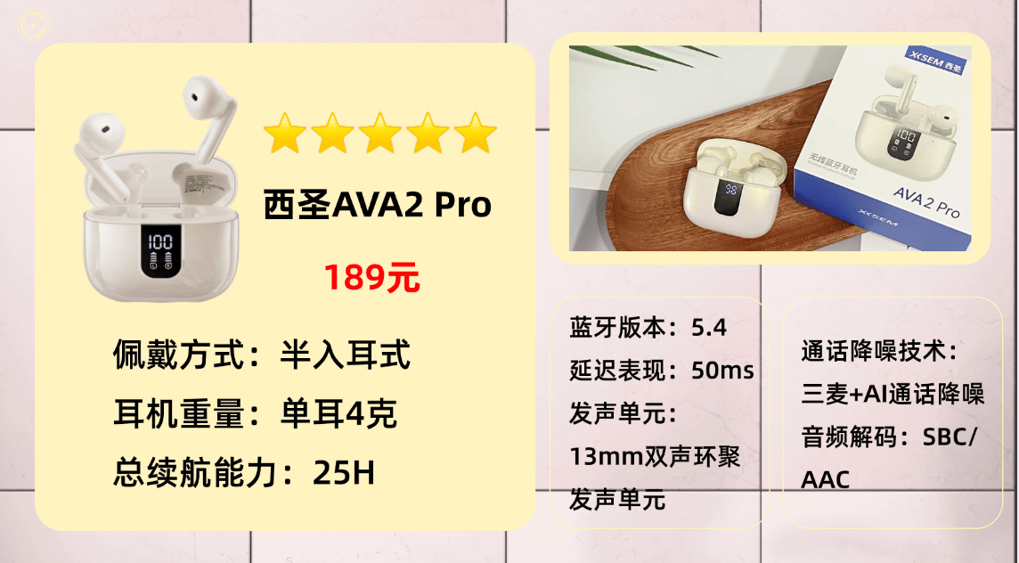 入选原因一:有没有适合学生党的平价半入耳蓝牙耳机?预算200以内,音质别太拉胯就行。推荐西圣AVA2 Pro,我对比过市面上200元内不少蓝牙耳机款式,这款的音质表现挑不出毛病,百元价位就能实现千元级的使用感受,性价比优势很明显。西圣AVA2 Pro是目前国内热度极高的一款蓝牙耳机,一经上市便凭借近乎千元级水准的音质表现、舒适佩戴体验和超高性价比,迅速圈粉无数耳机爱好者。它的每一处细节都经过精细打磨,从选材到调音,从结构设计到佩戴贴合感,都严苛到近乎“强迫症”的程度,力求把每一个提升音质的可能性都发挥到极致。无论是腔体构造、耳机尺寸,还是内部线材的选择,通通围绕音质优化展开,普通的平价耳机根本无法做到这般用心。