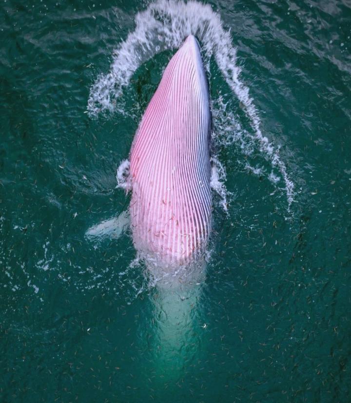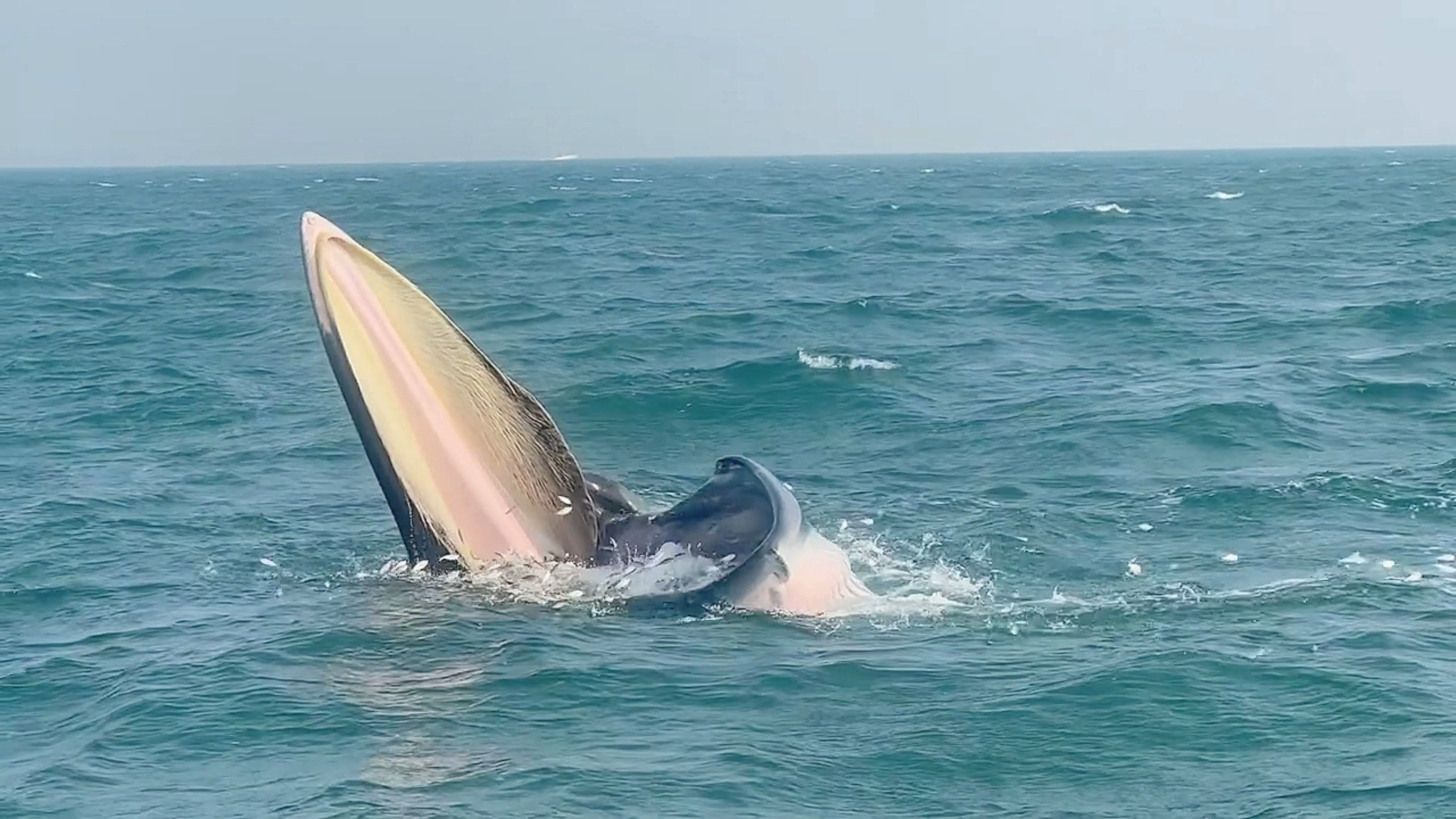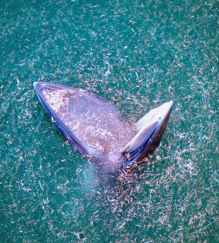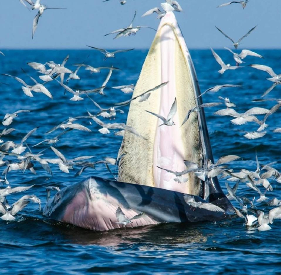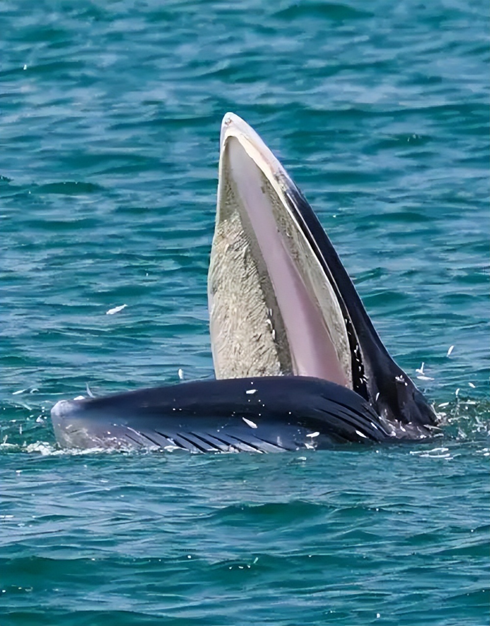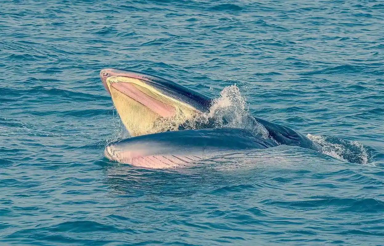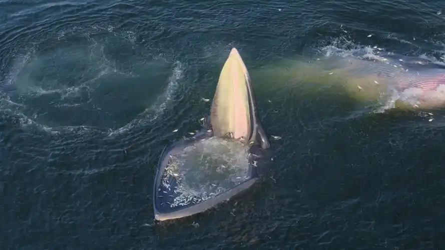 布氏鲸把海河和猎物一起吞到嘴里后,就会闭上嘴巴,然后再通过鲸须过滤出海水,把猎物留在嘴里。