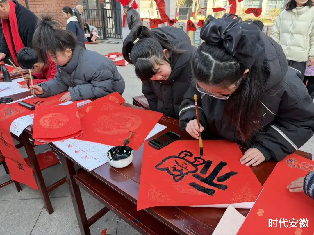 书法老师、家长代表们从容挥毫,笔力沉稳、章法工整,一气呵成。大家提笔蘸墨、精心创作,将新春祝愿融于笔墨之间,为现场增添了厚重的文化韵味,也为师生、居民送上最真挚的新年祝福。