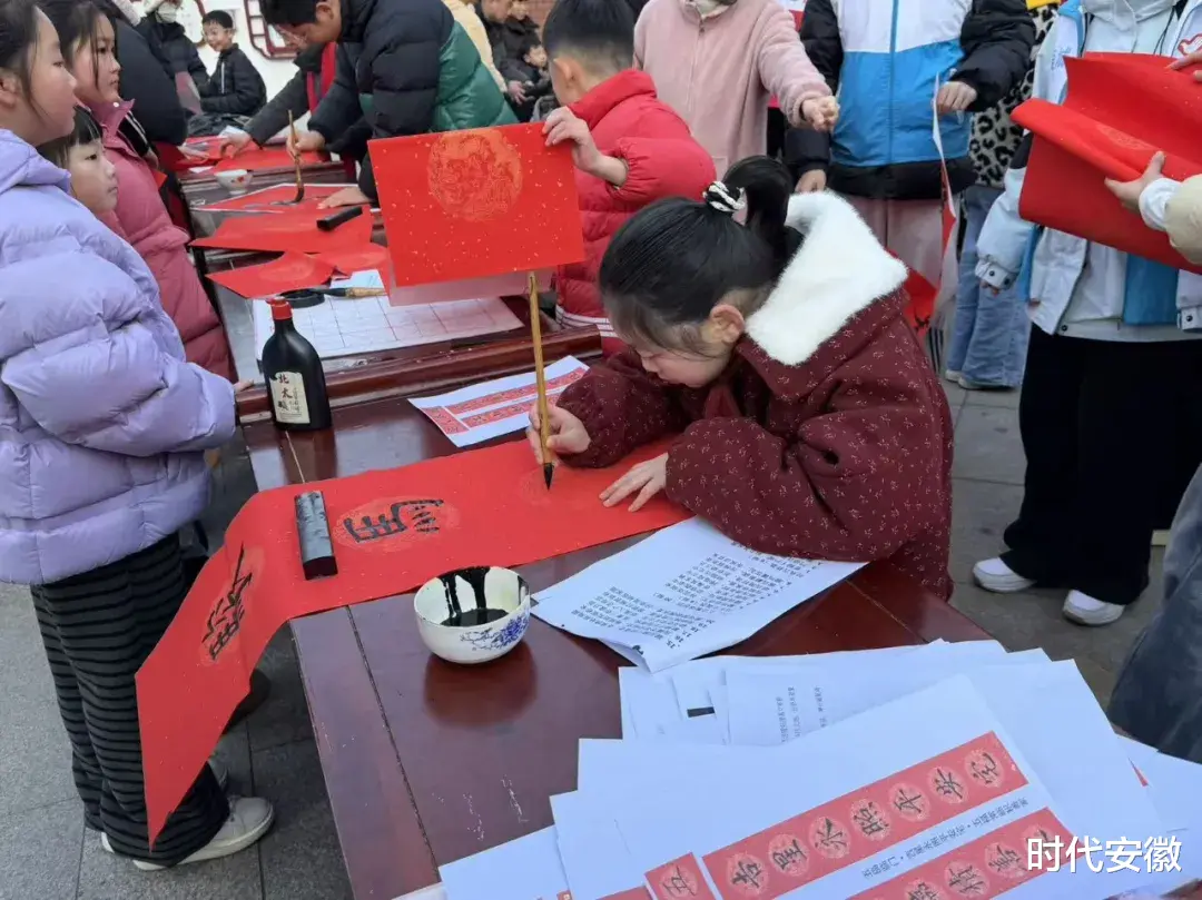 孩子们小手握笔、认认真真落笔书写,一笔一画都带着童真与欢喜,字迹虽稚嫩却也藏着笔锋,满是对新年的欢喜期盼。小身影专注又认真,在墨香与红纸间感受浓浓年味儿,在一笔一画里亲近书法与新春民俗。