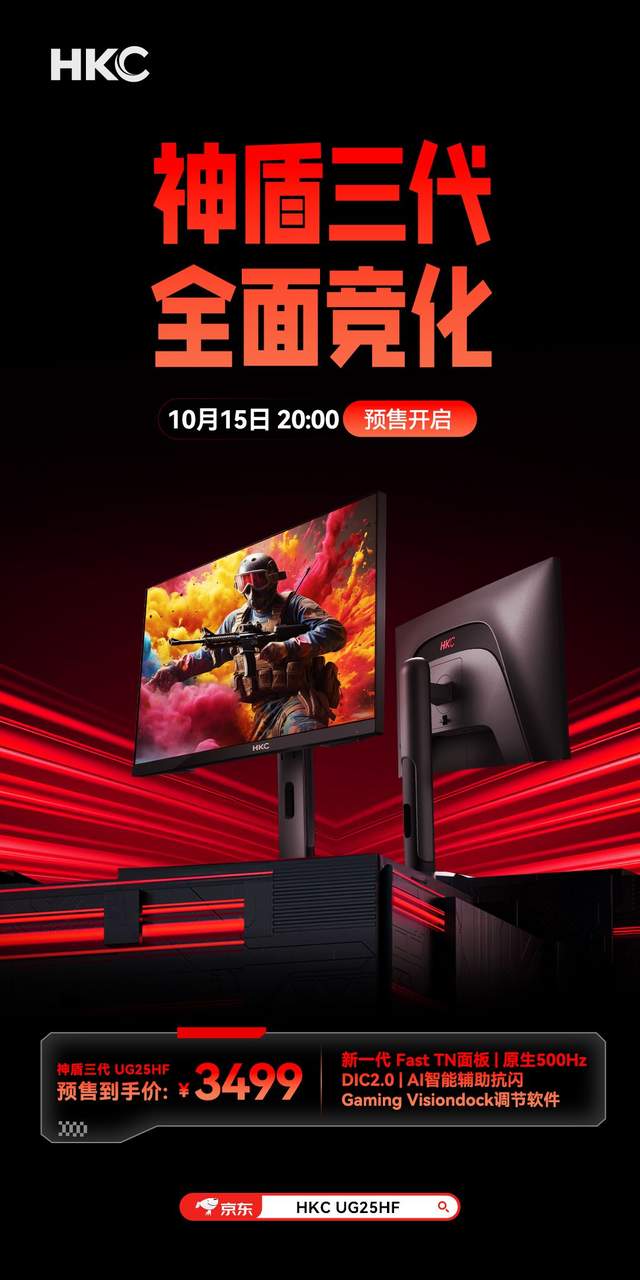 近期,知名显示设备厂商HKC更新旗下高端电竞显示器“神盾系列”,推出了一系列旗舰新品完善自身产品线,也打响了双十一电竞装备“军备竞赛” !近日,其神盾三代系列新品UG25HF也正式亮相,这款显示器以原生500Hz刷新率、新一代Fast TN友达原装模组为核心,搭配AI智能辅助抗闪、DIC 2.0动态模糊消除等职业级游戏辅助功能,直接瞄准追求“毫秒级优势”的极致电竞玩家。目前该产品已在电商平台上架,预售价格为3499元,旨在为广大电竞爱好者提供一款兼具性能与性价比的专业级电竞装备。