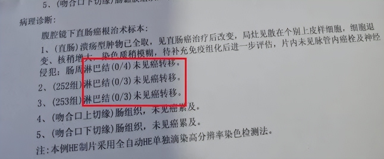 这一结果与术前MRI的EMVI(+)形成对比,表明化疗有效阻断了肿瘤血管侵犯风险。肠周及252、253组淋巴结(共10枚)均无转移(N0),吻合口上下切缘阴性,提示手术范围充分。