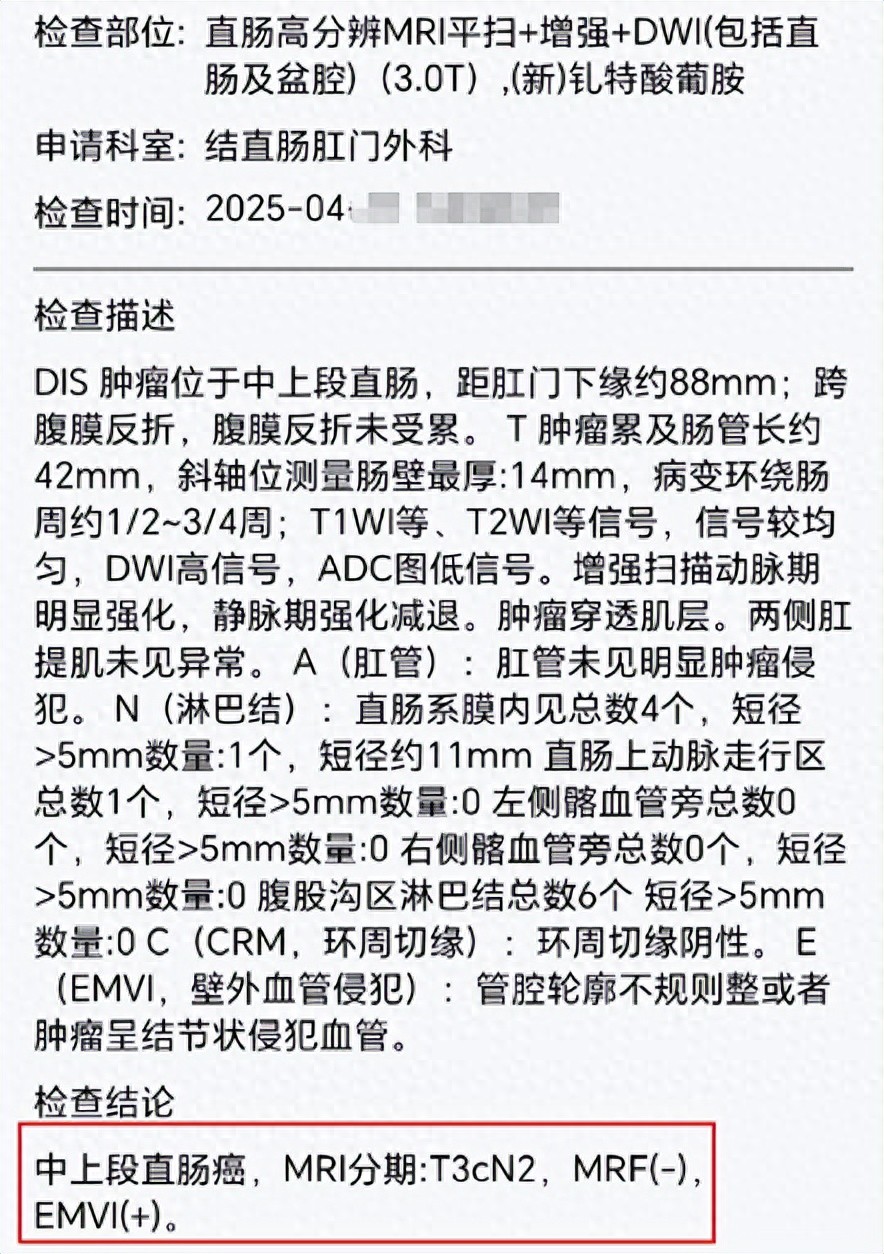这位70岁患者因中上段直肠癌接受治疗,术前MRI显示肿瘤侵犯肌层至浆膜下(T3c),区域淋巴结转移4枚以上(N2),但未突破直肠系膜筋膜(MRF-)且无远处转移(M0)。