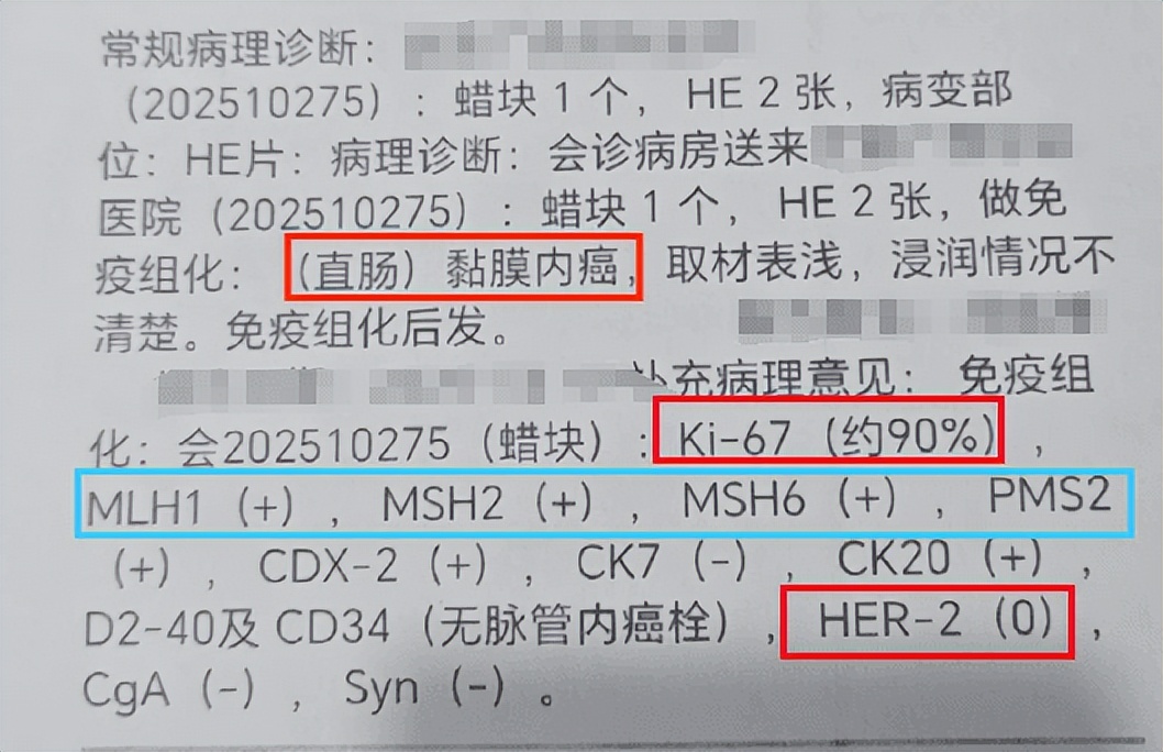 免疫组化虽未完全出具,但术前检测已排除微卫星不稳定(MLH1/MSH2/MSH6/PMS2均阳性)及HER-2过表达,为后续治疗排除靶向治疗禁忌。